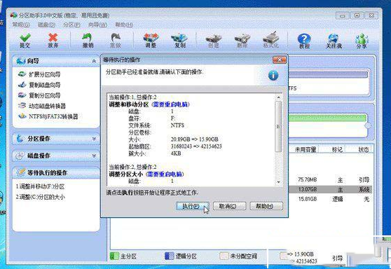 6、点击确定后,返回到主界面。看列表框中,这时C盘的大小为20GB,同时F盘的大小调整为15.90GB了。在主界面的左侧的“等待执行的操作”中你可以看到有两个需要执行的操作:一是调整并移动(F:)分区,二是调整(C:)分区的大小。