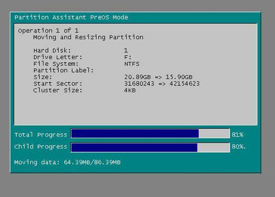 8、在点击执行后,分区助手可能会提示你重启电脑在重启模式(PreOS Mode)下执行这些操作,这时点击“是”以在重启模式下执行,但重启模式是英文的界面,下图是分区助手在重启模式下的执行状态: