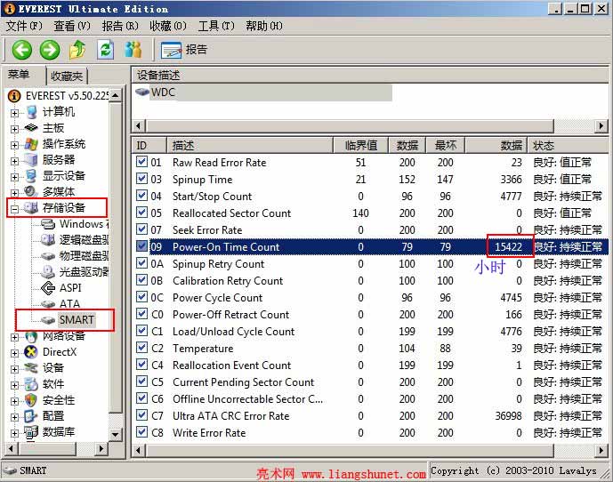 2、图中 Power-On Time Count 这行就是,硬盘累计使用已有 15422 小时,跟 ha_HDTunePro 显示的结果完全一样。