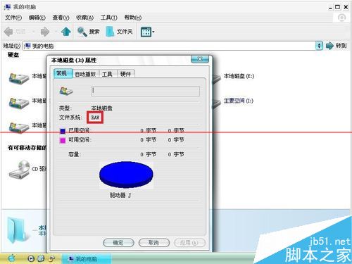 1、这个出错的特征是:右键分区属性,已用空间和可用空间都是0,系统文件是RAW。