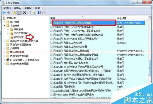 5、依次找到:本地策略→安全选项→在右面窗口中找到“网络访问:本地帐户的共享和安全模式”项。