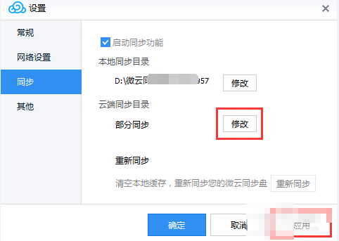 4、勾选完成之后,可以修改本地同步目录了,但云端同步目录还不能修改,需要先点击应用,然后云端同步目录的修改按钮就可以修改了