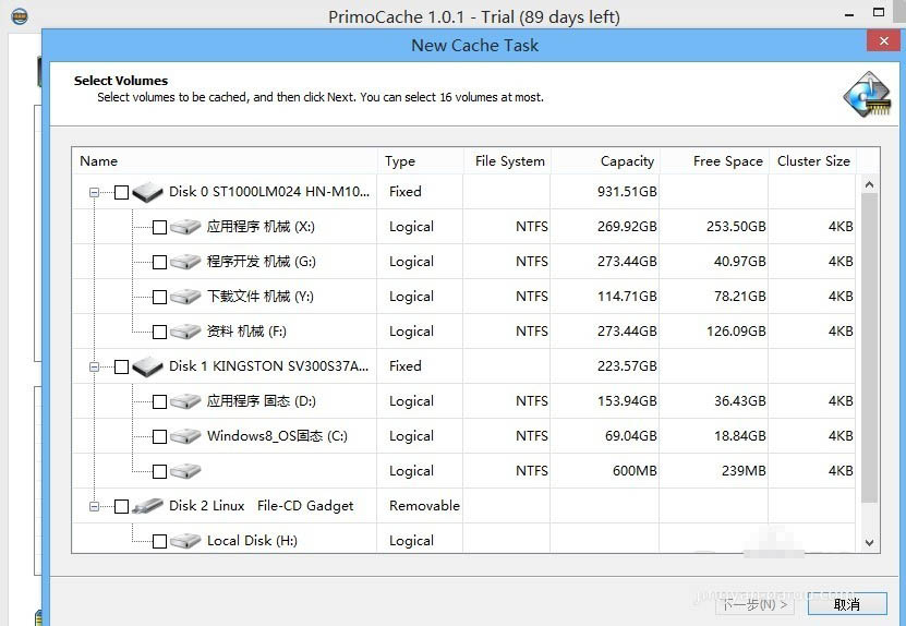3、选择你想要执行加速的硬盘,小编这里是希捷1000G机械硬盘。点击下一步。