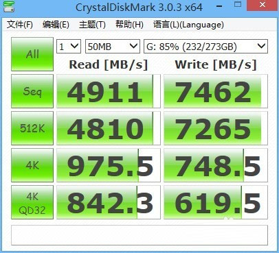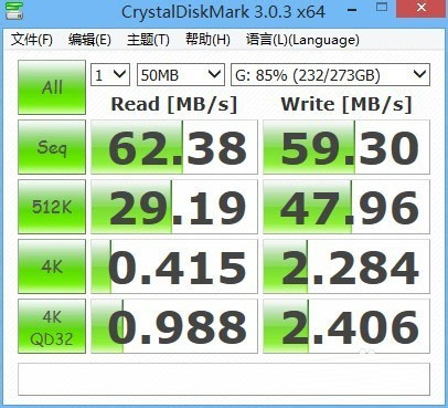 7、接下来我们来看看加速效果,选用CrystalDiskMark硬盘读写测试工具。这是测试前后对比图,大家可以看到效果还是十分明显的。