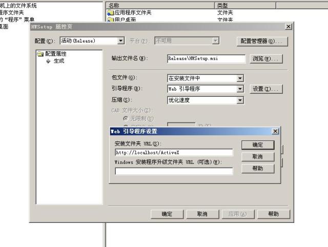 下一步,我们改动项目属性,将引导程序更改为 Web引导程序。很遗憾的是,在 Web引导程序设置 中的安装文件夹URL中必须使用绝对路径,不能使用相对路径。这意味着生成安装程序的时候就必须确定路径,不是很方便。在示例中,我使用了localhost,在发布中可以改为实际的域名。