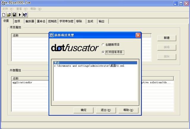 这里看到了2个选项,1个是打开现有项目,如果选这个你会发现要打开的是个XML文件,而不是DLL或EXE,因为dotfuscator是根据XML配置文件来进行处理的。XML配置文件你可以自己写,我比较喜欢自动生成XML。