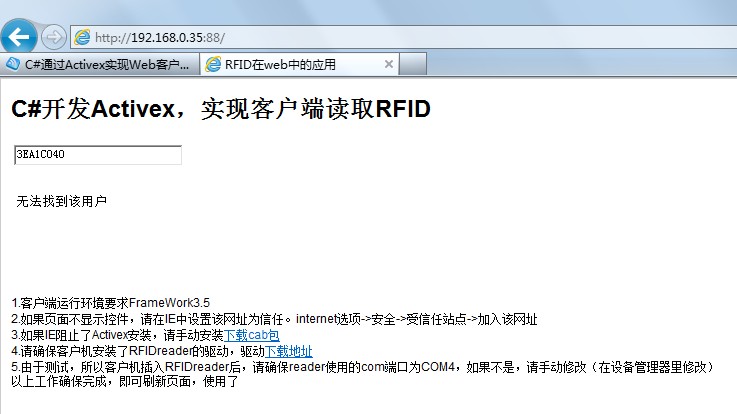 这里的RFID使用的是MasterRD.dll和CFCom.dll不同产品使用可能不同,同时注意RFID的COM端口号,本例为测试例子,所以写死了COM口,客户端IE浏览时,需要将RFID的端口改成对应的。