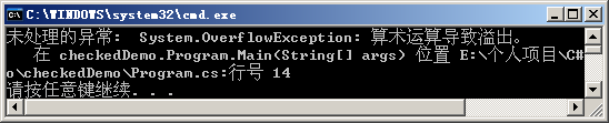 将上述代码放在checked块中,将会引发System.OverflowException类型。