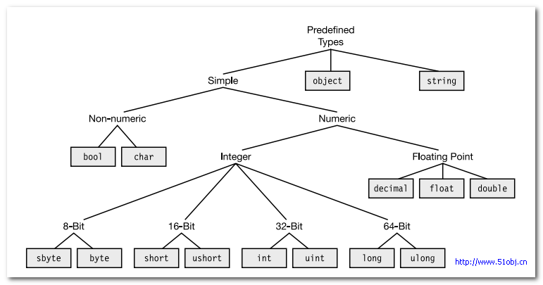 C#中有15种预定义类型,其中13种简单类型(simple type),两种非简单类型(non-simple types);13种简单类型中其中包括11种数字类型、一种unicode字符类型(即char)、一种boolean类型(即bool);数字类型中又包括可变长度的整型、浮点类型(float和double)、高精确度decimal类型。两种非简单类型包括string、object。结构如下图(可点击看大图):
