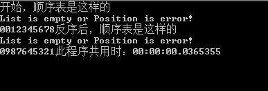 该算法只是对顺序表中的数据元素顺序扫描一遍即完成了倒置, 所以时间复杂度为 O(n)。其中运行效果如图所示: