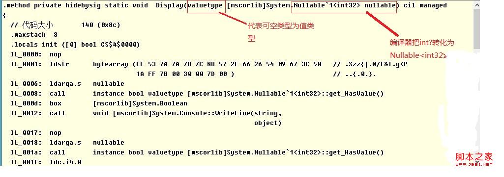 上面的演示代码中都注释,这里就不再解释了,为了让大家明白进一步理解可空类型是值类型,下面贴出中间语言代码截图: