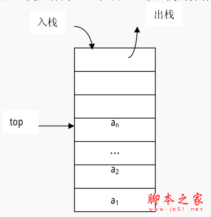 栈通常记为:S= (a1,a2,…,an),S是英文单词stack的第 1 个字母。a1为栈底元素,an为栈顶元素。这n个数据元素按照a1,a2,…,an的顺序依次入栈,而出栈的次序相反,an第一个出栈,a1最后一个出栈。所以,栈的操作是按照后进先出(Last In First Out,简称LIFO)或先进后出(First In Last Out,简称FILO)的原则进行的, 因此, 栈又称为LIFO表或FILO表。 栈的操作示意图如图所示。