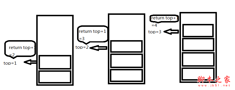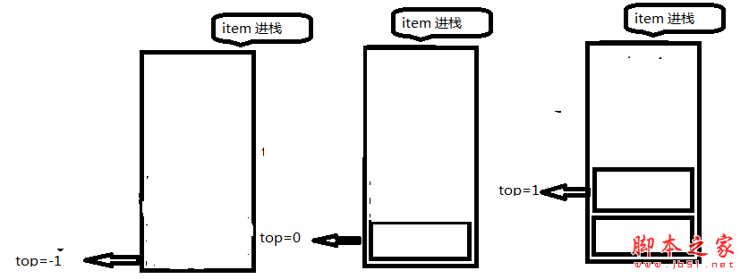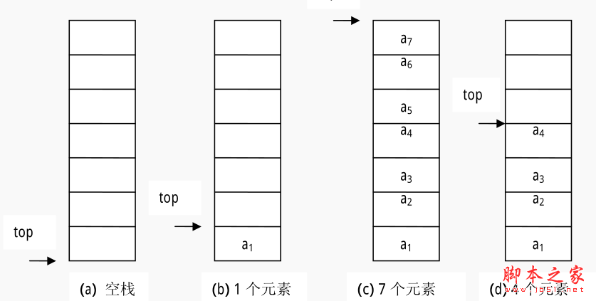 用一片连续的存储空间来存储栈中的数据元素,这样的栈称为顺序栈(Sequence Stack)。类似于顺序表,用一维数组来存放顺序栈中的数据元素。栈顶指示器 top 设在数组下标为 0 的端,top 随着插入和删除而变化,当栈为空时,top=-1。下图是顺序栈的栈顶指示器 top与栈中数据元素的关系图。
