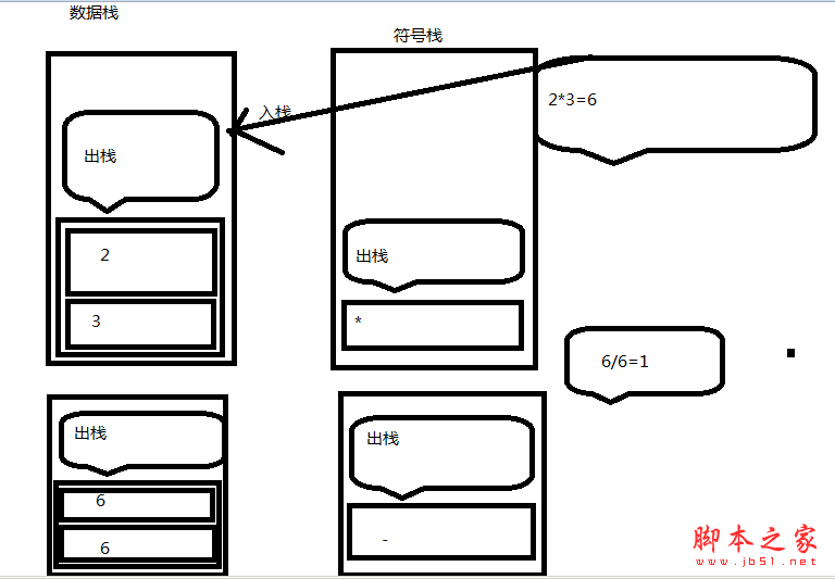 于是让我们看看如果引入第三个栈作符号栈会如何?符号栈的功能是保存所有分析过程中的符号,包括数符和运算符两种。