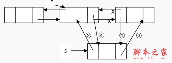 下面,看他的删除操作,以在结点之后删除为例来说明在双向链表中删除结点的情况。 设 p是指向双向链表中的某一结点,即 p存储的是该结点的地址,现要将一个结点 s插入到结点 p的后面 。伪代码如下:操作如下: