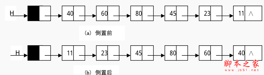应用举例一 已知单链表 H,写一算法将其倒置,即实现如图所示的操作,其中(a)为倒置前,(b)为倒置后。