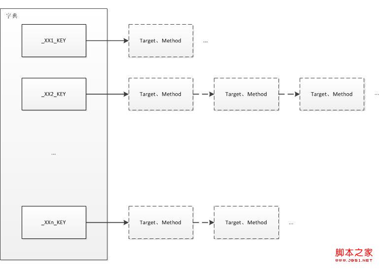存放事件委托链表的容器为Dictionary<object,Delegate>类型,该容器存放各个委托链表的表头,每当有一个“事件注册”的动作发生时,先查找字典中是否有表头,如果有,直接加到表头后面;如果没有,向字典中新加一个表头。“事件注销”操作类似。