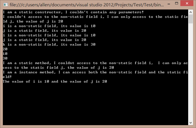 从运行结果可以看出,在Main方法中创建了两个Test对象,静态构造函数只执行了一次,且先于实例构造函数执行,实例构造函数在两次实例化过程中各执行了一次。同时可以看到我们是通过Test.j来调用的j字段,而i字段和k字段的调用则通过Test的两个对象t1和t2调用。同样的,静态方法StaticPrint也是用Test类来调用,而实例方法Print通过Test类的对象来调用。