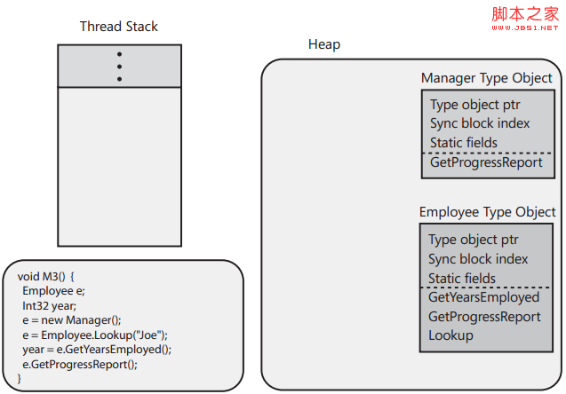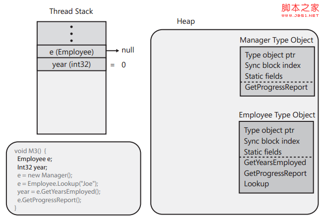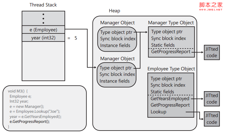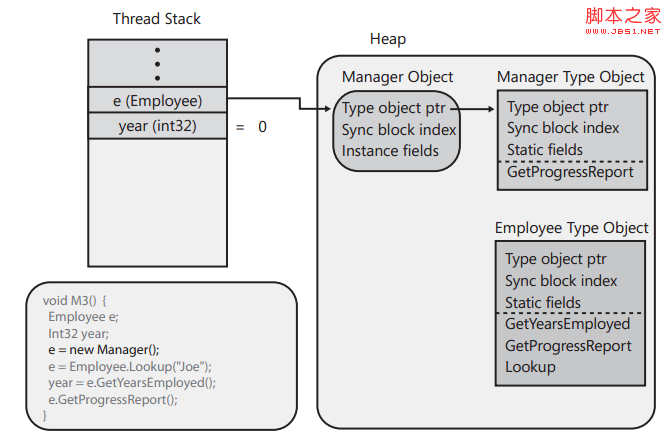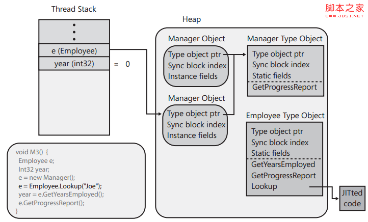6)GetYearsLookup是一个非虚实例方法,在调用时,JIT编译器会找到发出调用的标量(e)的类型对应的类型对象,本例中为Employee类型对象,因为e被定义为了Employee类型。如果Employee中没有定义该方法,则会继续向上一层查找,知道查找到Object类型对象,查找到该方法后,JIT编译器对其进行编译(第一次执行),再执行变异后的代码,将执行结果保存在局部变量中。见下图: