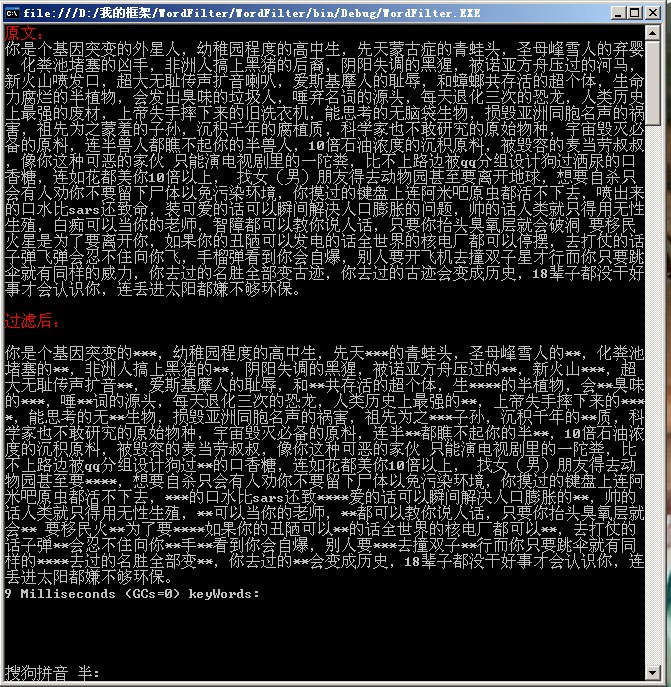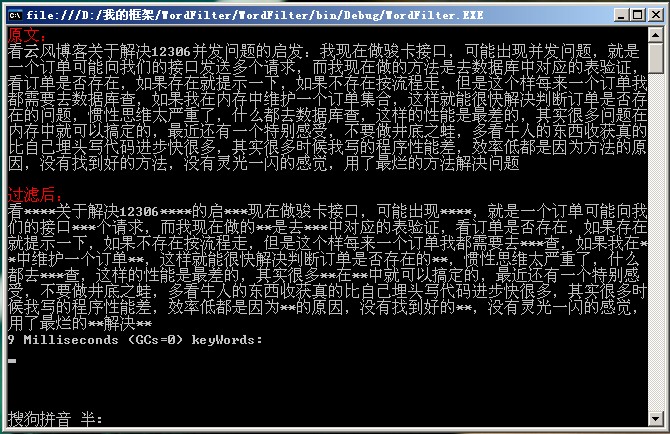 思路就这么简单,我靠!连有的搜索引擎也用这种思路。这种撒列的方式处理关键字过滤速度的确是蛮快,10000个字组织成一个撒列表也就几毫秒,只要你预分配的内存较好,基本上没什么操作,就是向内存中填数据。在撒列表中判断一个键是否存在的时间复杂度为O(1),其实还可以自己重写Dictionary<TKey, TValue>,关键字过滤的效率可能会更好点。
