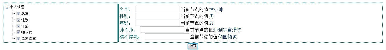 主要功能:勾选子节点的checkbox,右边会动态加载该节点的信息,出现TextBox让用户填写节点的值,点击保存按钮将文本框的值保存到对应的节点。