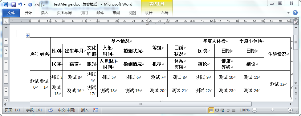 这样设计好Word模板后,下一步就是如何利用代码生成二维表格了。首先这里提示一下,就是我故意设置了每个表格单元格的宽度不同,所以也就要求生成的行要和头部对应,所以表格生成每行之前,肯定要获得对应列的样式属性的,否则就会对应不上了。下面看代码。