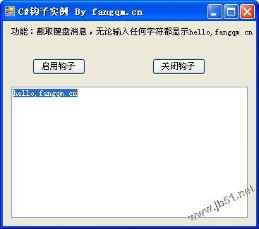 方法的内容可以根据需要编写,我们需要TextBox显示“ fangqm.cn”,那我们就写在这里。当钩子截获到消息后就会调用钩子子程,这段程序结束后才往下进行。截获的消息怎么处理就要看子程的返回值了,如果返回1,则结束消息,这个消息到此为止,不再传递。如果返回0或调用CallNextHookEx函数则消息出了这个钩子继续往下传递,也就是传给消息真正的接受者。