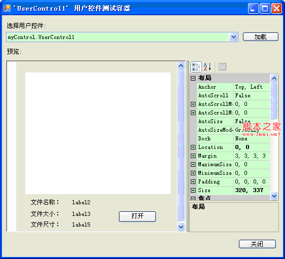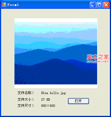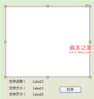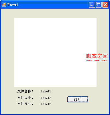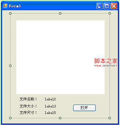 如上图,设置pictureBox的Name为picBox,背景为白色,Button的Name为btnOpen,另外靠左的三个Lable的Text属性分别为:文件名称,文件大小,文件尺寸,靠右的三个Lable的Name分别为:lblName, lblLength, lblSize.