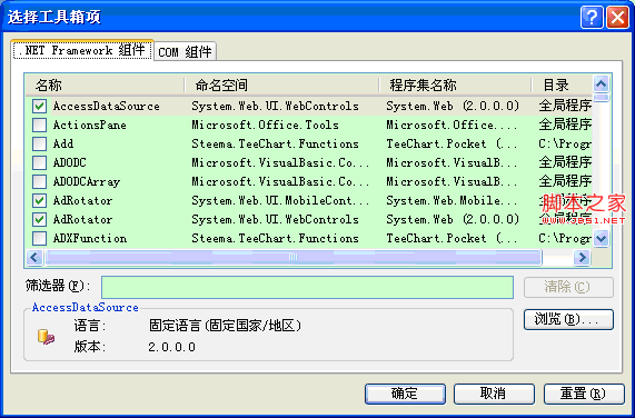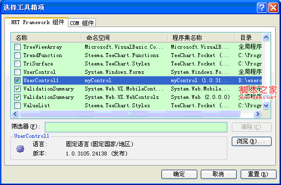 选中控件文件 mybutton.dll ,单击“打开”按钮,回到自定义工具箱,系统会默认把你刚才选中的控件打上勾。