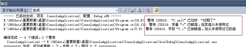 注意:我所使用的是vs2010如果多次编译会自动将警告去除,如希望确保警告在输出中被显示,可以为项目做下清理: