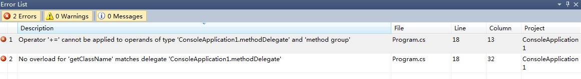 当指向签名不符的方法时会提示如下错误,证实了委托的安全性。