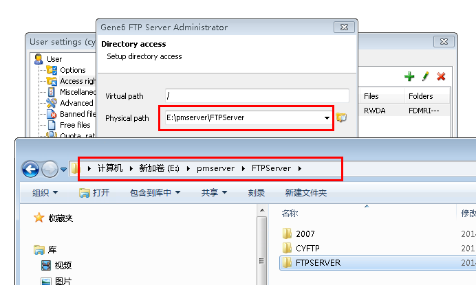 那2007这个文件夹在什么位置呢?可以看到,2007这个文件夹是在ftpserver的上一级目录,而ftp设置的默认目录为ftpserver里,也就是说在程序中默认打开的目录对应的物理地址是E:\pmserver\FTPServer\FTPSERVER,您也看到了,E:\pmserver\FTPServer\FTPSERVER目录下根本就没有2007的文件夹,所以就会抛出异常"远程服务器返回错误:(550)文件不可用(例如,未找到文件,无法访问文件)"。