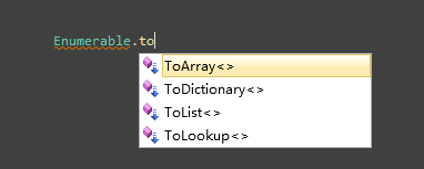 从图中我们看到有四个ToXXX的方法,其中ToArray和ToList,我想大家用的是非常非常多,但是ToDictionary和ToLookup不见得有多少人用了,但不能否认的是这些方法确实很有用。