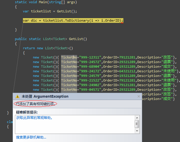从图中我们可以看到,发生悲剧的异常了,我们知道dictionary中key是不能重复的,然而ToDictionary中并没有给我们做key的重复值判断,那也就侧面说明ToDictionary在kv中只能是 “一对一”的关系,也就是v中永远只会有一条记录,显然这不是我需要的,在了解ToDictionary原理后,该方案失败。