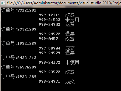 好了,我们看看需求,票号和订单号是一对多的关系,也就是说一个订单号可能包含几个票号,每个票号都有自己对应的状态,比如票号有 “改签”,"未使用",“成交”,"退票" 等等,下面我们灌一批数据进去。