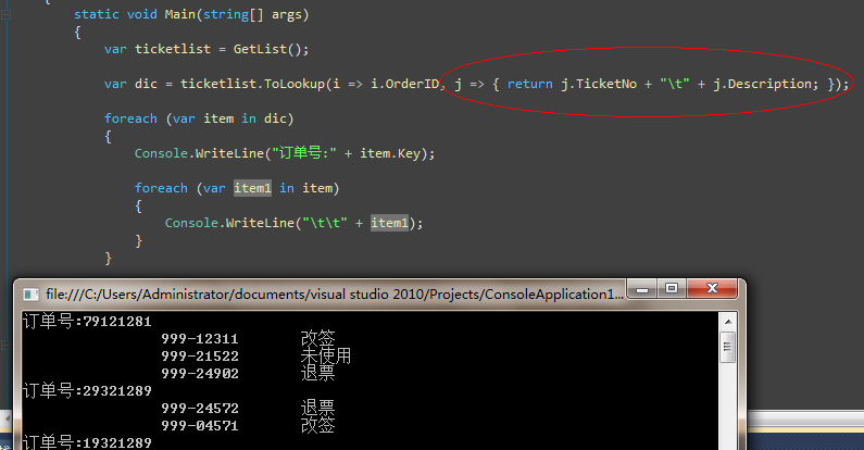 而且ToLookup和字典一样,是带有索引形式,这个groupby就不具备了,当然Tolookup还有一个强大的功能,就是使用Func<TSource, TElement> elementSelector来对现在的v元素进行转换来避免我刚才 Console.WriteLine("\t\t" + item1.TicketNo + " " + item1.Description);语句