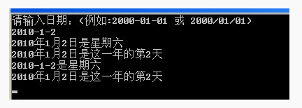 Console.WriteLine("请输入日期:(例如:2000-01-01 或 2000/01/01)");