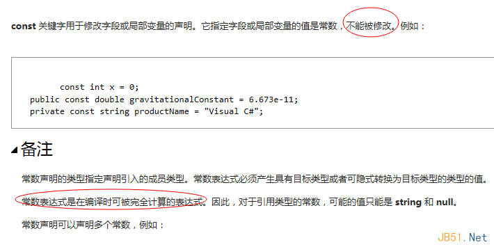 1.先来看看msdn上面对const是怎么说的,我们会看到。不能修改,编译时常量这些关键性信息。