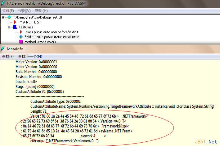 很可惜,我并没有找到Ctrip的符号,也没有找到int.MaxValue,也没有找到所谓的0x7fffffff,倒是找到了一个Assembly的一些版本信息的元数据,那么这时候你可能会疑惑了,究竟const的值有没有保存到Assembly里面去呢?很简单的一个验证方法就是,把Mainproject下面bin中的Test.dll删除掉,看看会有怎么样的奇迹发生。