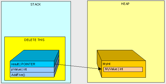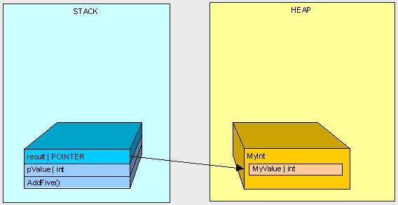 由于MyInt是一个引用类型,所以它被分配到堆上,并且在栈中生成一个指针(result),如图9: