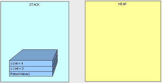 栈通常保存着我们代码执行的步骤,如在代码段1中 AddFive()方法,int pValue变量,int result变量等等。而堆上存放的则多是对象,数据等。(译者注:忽略编译器优化)我们可以把栈想象成一个接着一个叠放在一起的盒子。当我们使用的时候,每次从最顶部取走一个盒子。栈也是如此,当一个方法(或类型)被调用完成的时候,就从栈顶取走(called a Frame,译注:调用帧),接着下一个。堆则不然,像是一个仓库,储存着我们使用的各种对象等信息,跟栈不同的是他们被调用完毕不会立即被清理掉。