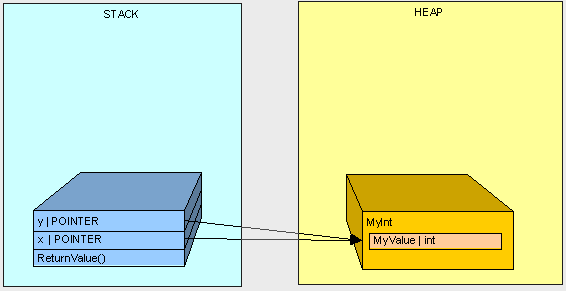 栈上的指针x和y指向堆上同一个区域,修改其一必会改变堆上的数据。
