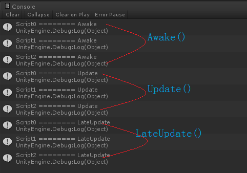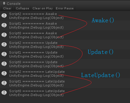 再次运行游戏,看看它的结果。脚本的执行顺序和以前完全一样,Script0即便删除掉了Update方法,但是它也不会直接执行LateUpdate方法,而是等待Script1和Script2中的Update方法都执行完毕以后,再去执行所有的LateUpdate方法。