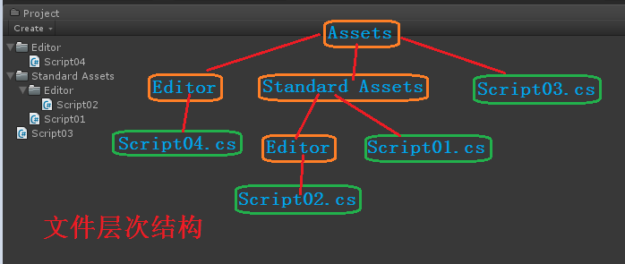 由于脚本的编译顺序会涉及到特殊文件夹,比如上面提到的Plugins、Editor还有Standard Assets等标准的资源文件夹,所以脚本的放置位置就非常重要了。下面用一个例子来说明不同文件夹中的脚本的编译顺序: