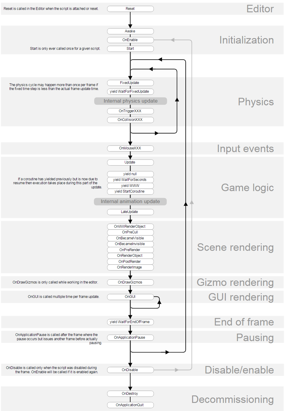 通过这两个例子,我们就可以很清楚地断定,Unity后台是如何执行脚本的了。每个脚本的Awake、Start、Update、LateUpdate、FixedUpdate等等,所有的方法在后台都会被汇总到一起: