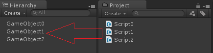 在Hierarchy视图中创建三个游戏对象,在Project视图中创建三条脚本,如下图所示,然后按照顺序将脚本绑定到对应的游戏对象上: