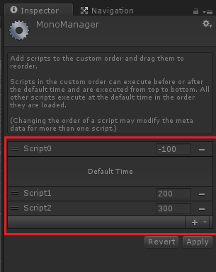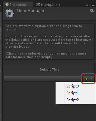 点击右下角的"+"将弹出下拉窗口,包括游戏中的所有脚本。脚本添加完毕后,可以用鼠标拖动脚本来为脚本排序,脚本名后面的数字也越小,脚本越靠上,也就越先执行。其中的Default Time表示没有设置脚本的执行顺序的那些脚本的执行顺序。