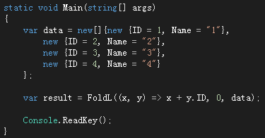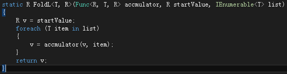这个标准高阶函数可能会比较难,因为它分为了左折叠和右折叠两种。接收的参数有三个,分别是起始值,累加函数,列表。大致的执行过程就是在第一次调用我们的累加函数时将起始值作为一个参数,而列表中的第一个值作为第二个参数去调用我们的累加函数,累加函数计算出结果,而这个结果将作为下一次调用累加函数时的第一参数,而第二个参数则是列表中的下一项,以此类推。所以通过这个高阶函数我们可以直接计算出列表中每项数据累加后的结果,而在FCSLib中的具体实现则如下所示: