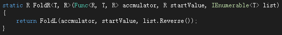 左折叠完成之后对应的还有一个右折叠,当然根据名字也可以猜出。就是从list的末尾开始进行循环,所以我们可以这样来实现FoldR: