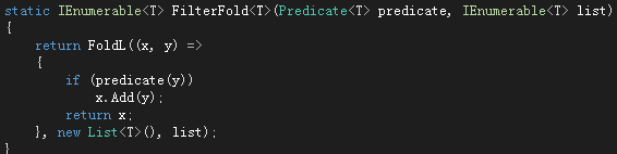 这里我们就是利用Fold函数的一个特性来实现的,因为累加函数每次都会将上一次计算得出的结果传递给下一个累加函数(new List<R>()我们直接将其作为起始值传入),最后我们都会通过return x将这个列表返回,这样下一次再调用这个累加函数之后x依然是同一个列表。对应的还有Filter的实现: